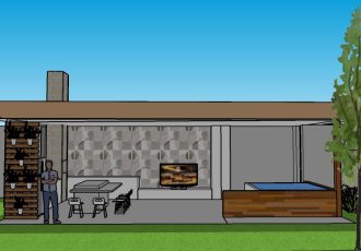 PROJETO DE ÁREA GOURMET Projeto e maquete 3D área gourmet. Área gourmet estilo moderno com telhado embutido / platibanda. Churrasqueira, ilha com mesa, espaço de estar, hidromassagem, e lavabo.