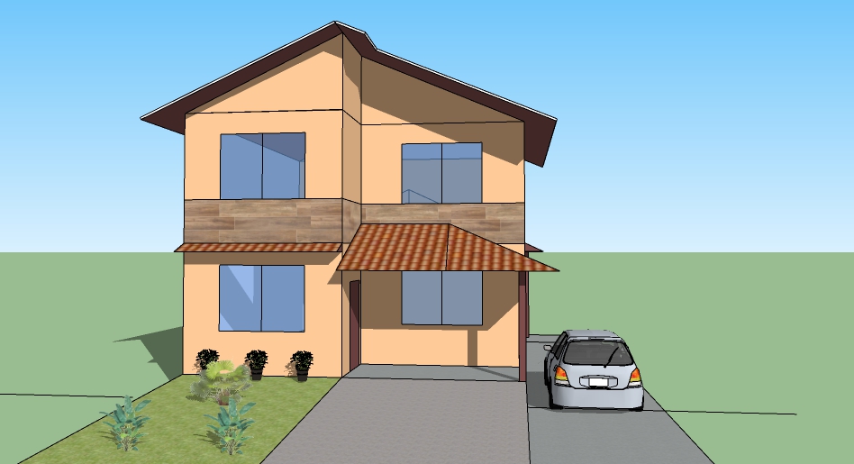 Estilo rústico, com telhas cerâmicas. Telhado maior com duas águas, e recorte, um telhado na varanda frontal com duas águas e um na varanda posterior com 3 águas.